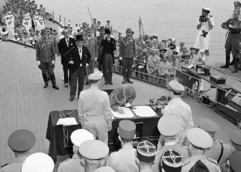 1945年9月2日,日本政府代表在美軍“密蘇里”號(hào)軍艦上簽署無條件投降書。